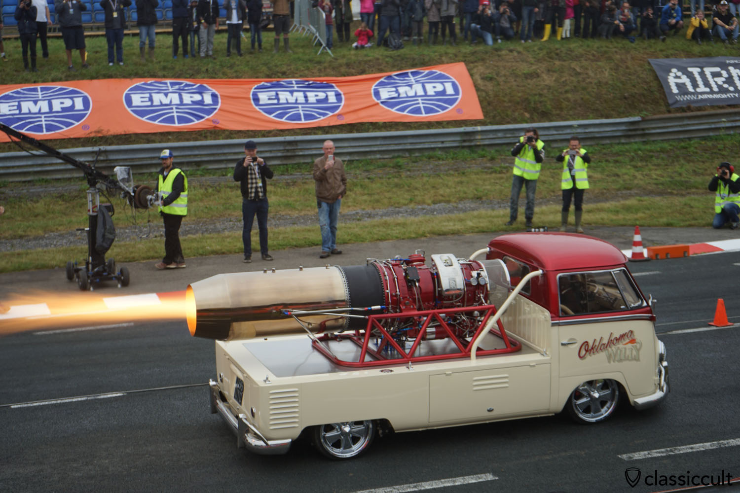 It was again bad weather on Sunday. Some VW fans could do a bit drag racing in the morning, just to get the racetrack dry. At about 10:45 was show time for the Oklahoma Willy jet powered VW Pickup. This Jet-Split-Bus is superb entertainment even for legends like the Godfather of Cal-look, Ron Fleming DKP. If you ever see the Bus, e.g. at Bug Jam Santa Pod UK, choose your viewing place in connection with the wind direction. I was in the middle of the exhaust gas cloud…